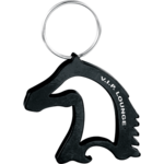 The Horse Head Shaped Bottle Opener opens bottles and flip-top cans. It includes a metal split key ring.