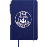The 6" x 8.5" Viola Bound Notebook with Metal Pen includes 80 ruled pages and features an aluminum ballpoint pen and spine pen slot. A pen imprint is not available.