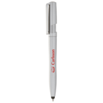 The Villa Multi-Function Pen-Stylus Highlighter features a sleek, metallic finish barrel with rubber stylus on tip. Cap off design includes a screen cleaner for device screens and built in phone stand. Twist action mechanism. Black ink cartridge and yellow highlighter tip.