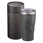 Do not miss the most trendy tumbler of the year. Durable, double-wall stainless steel vacuum powder coated, construction with copper insulation, which allows your beverage to stay cold for 24 hours and at least 8 hours for hot beverages. The construction also prevents condensation on the outside of the tumbler. Push-on two piece lid with Tritan™ swivel closure, pinch the 2 axis joints slightly to remove the top part of the lid for easy cleaning. Wide opening for comfortable filling and pouring. Design features the spinning, geometric bottom. Leed's Exclusive. 20oz. 1626-95. Laser engraving silver Drinkware will result in a subtle, tone on tone decoration