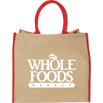 The Large Jute Tote has an open main compartment and double 17 inch handles. Disclaimer: Minimum of 32pt. font size. Bold artwork only. No fine graphics or text.
