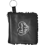 the Reversible Sequins Pocket Pouch features sequins in black and silver with a key ring attached. Perfect Size to hold keys, coins or cash. Keep cables, earbuds or cosmetics inside. Imprint on backside.