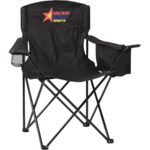 This extra sturdy steel frame chair features a mesh cup holder on one arm, and a cooler in the other arm that can hold a full six pack. Cooler zipper has attached bottle opener. Perfect for the camp, beach, or tailgate! Durable construction in 600D fabric and steel frame, this chair has a loading weight limit of 300lbs. Includes a sturdy 600D carrying bag.