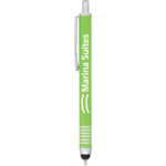 The Zoe Metal Ballpoint Pen-Stylus features a retractable ballpoint pen with a soft rubber stylus for touchscreen devices. A media device not included. Licensed under U.S. Pat. Nos. 8,847,930 and 9,092,077